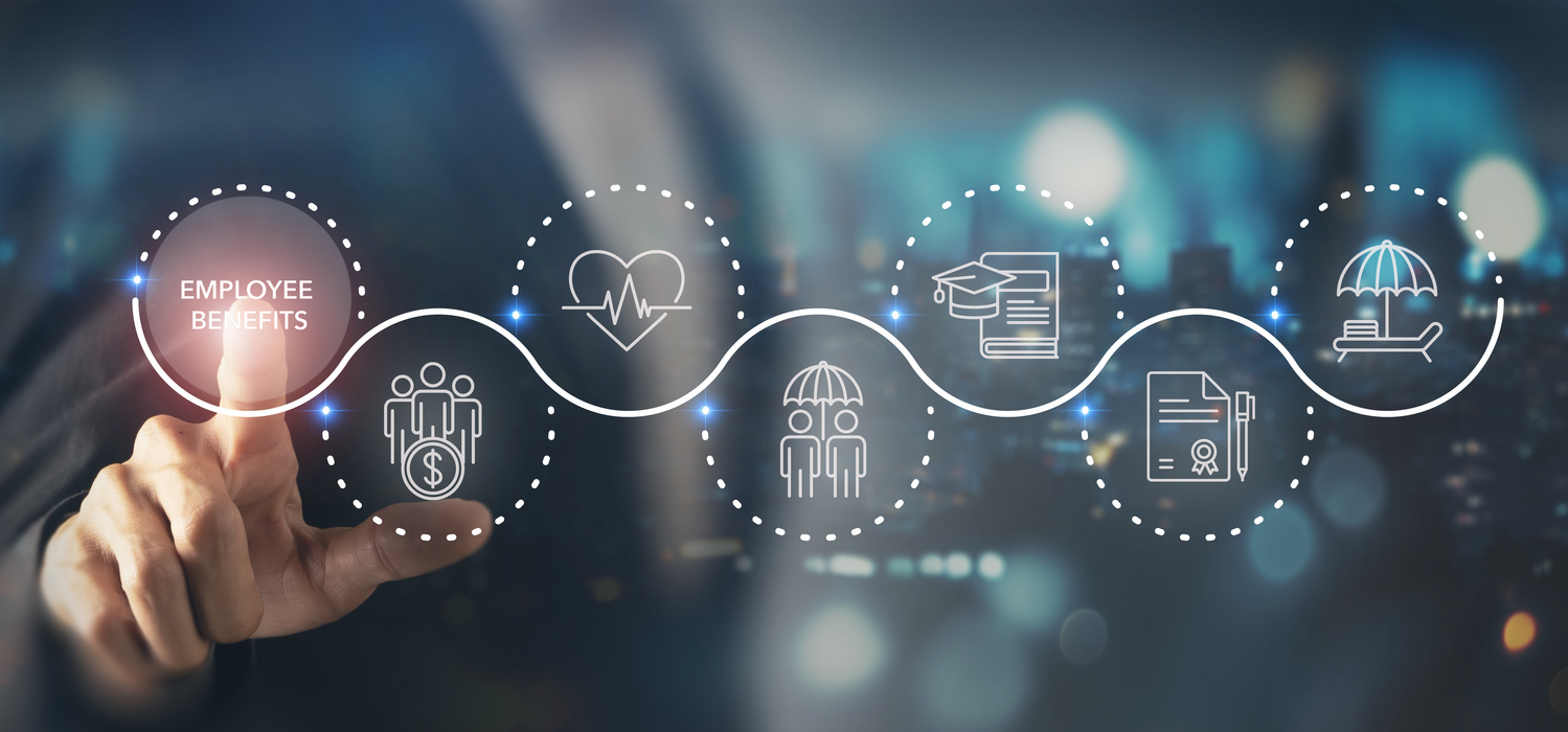 Employee benefits concept. Indirect and non-cash compensation paid to employees offered to attract and retain employees. Fringe benefits for employee engagement. Insurance, paid vacation, office perks