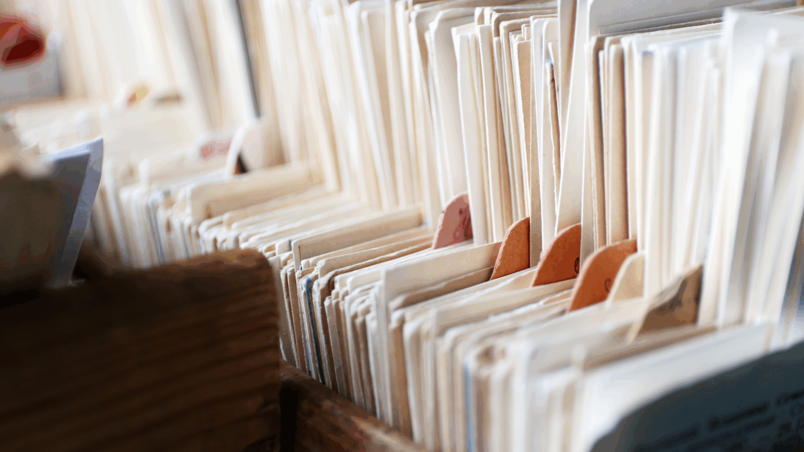 Papers in file folders, representing scholarly articles collected by a researcher or library